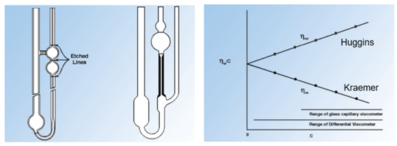 左圖: 标準玻璃毛細管粘度計(jì)圖 右圖:Huggins曲線外推和Kraemer曲線外推