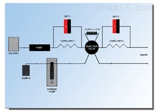 與玻璃毛細管粘度計(jì)通過檢測溶液通過毛細管的時間不同,美國(guó)HMJ公司DSV稀溶液粘度儀利用壓力變化檢測相(xiàng)對粘度。兩個毛細管串聯在一起,進樣閥位于兩個毛細管 1 和 2 中間。壓差傳感器檢測每個毛細管兩端的壓力降。當樣品被注入第二個毛細管時,壓差傳感器檢測到毛細管2上的壓力變化(圖3)。相(xiàng)對粘度等于兩個毛細管壓力降的比值乘以儀器常數K。