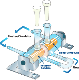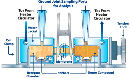 由水平式擴散池(一般稱之Side-Bi-Side Cell,另有一變種稱之爲Valia-Chien Cell)、底座、和循環水浴(選配)組成。